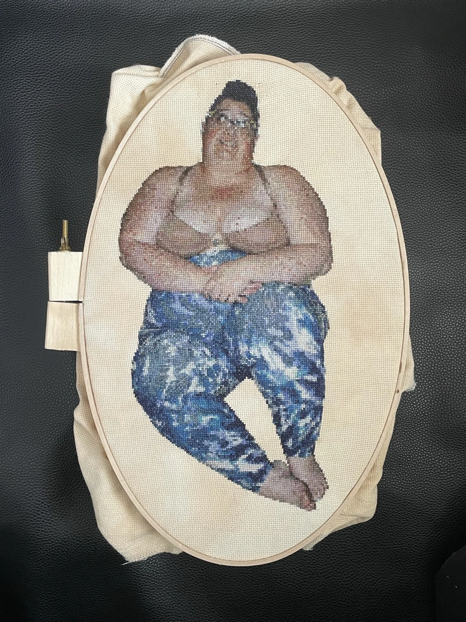 These pieces seek to capture the “invisible” experiences of individuals who live with chronic illnesses through a series of double-sided hand-embroidered portraits that are displayed with both sides of the pieces visible to viewers. The “fronts” of each piece are a representational portrait of each individual in cross-stitch embroidery, depicting them as they feel is appropriate for the project – perhaps at their most authentic and natural, as they see themselves or as others see them, or as they appear when they feel most ill – it is up to each individual to determine what they feel might be the best representation of themselves, with my support. The reverse of each piece uses free-form embroidery and mixed-media collage to reproduce the experiences of the collaborators through the use of visual metaphor, colour, texture, and the display of the pieces.